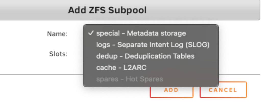 Unraid 将 ZFS 支持 vdevs 称作子池。大多数用户不需要这些,但有经验的用户可能会使用:
