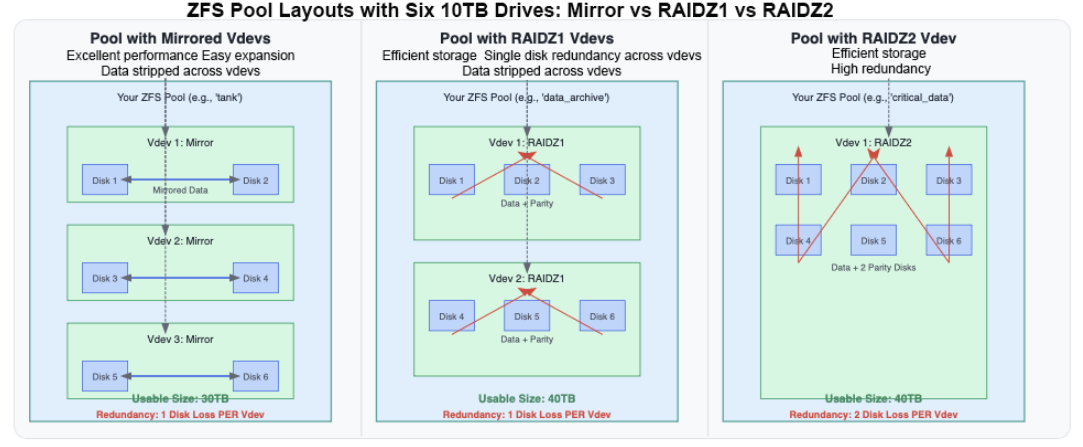 Vdev 冗余是局部的: ZFS 中的冗余是局部的,不是在整个池上共享。请确保规划 vdev 布局以实现所需的强度。